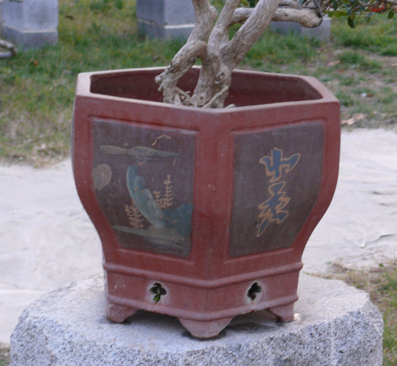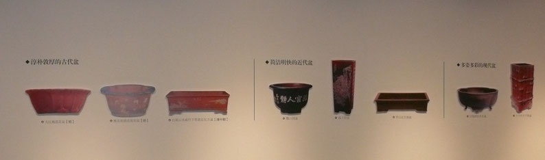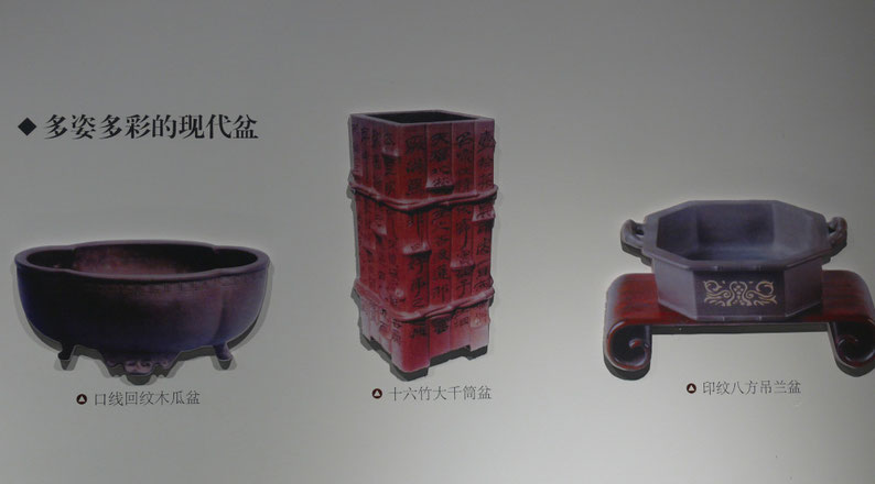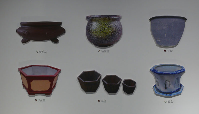 In the newly opened Penjing Museum of Rugao many beautiful penjing in interesting pots were displayed. Pots received special attention in the form of pictures on the wall.