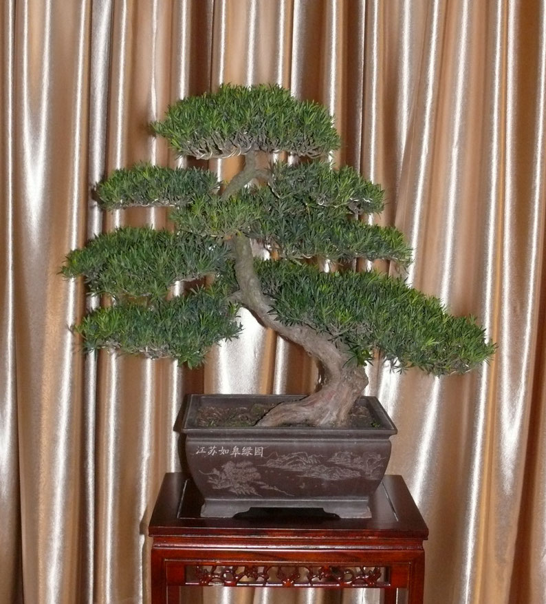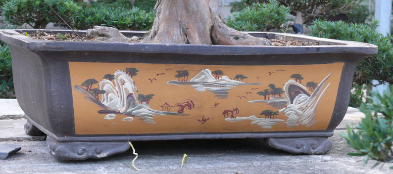 A podocarpus in an unglazed pot decorated with a landscape motif.