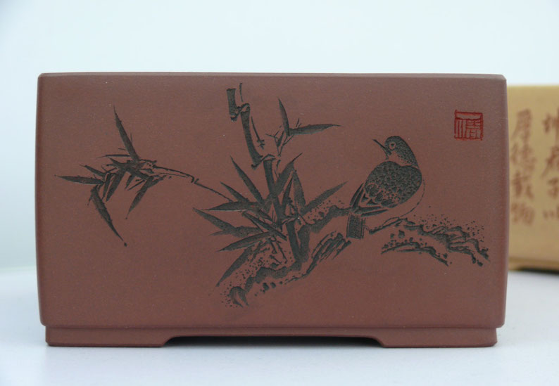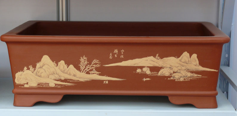 A rectangular unglazed pot with a carved and colored landscape motif and Chinese characters.