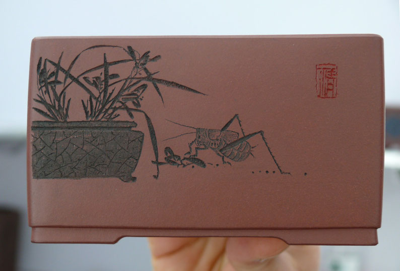 Eine rechteckige, unglasierte Schale mit eingeritztem und eingefärbtem Landschafsmotiv und Schriftzeichen.