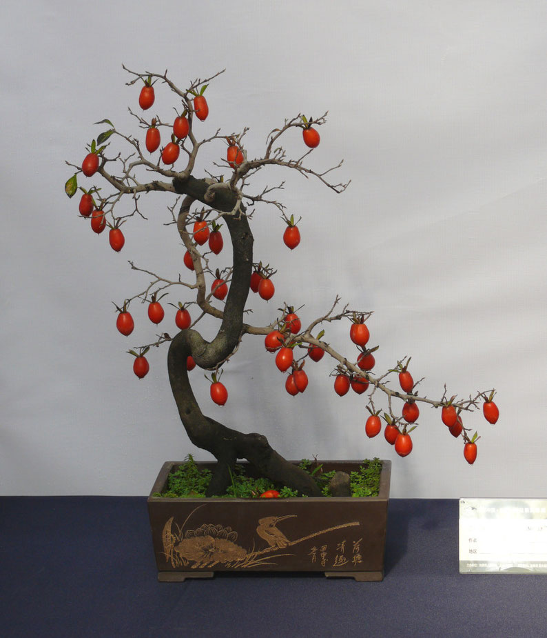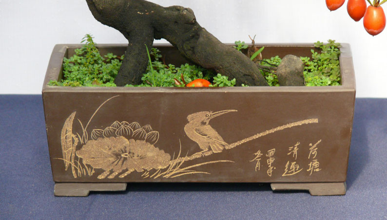 A wonderful very big Chinese quince with fruit and beginning fall color. The pot is a simple oval one. Instead of a display table four little pedestals made out of carved wood were used, which were placed under the feet of the pot.