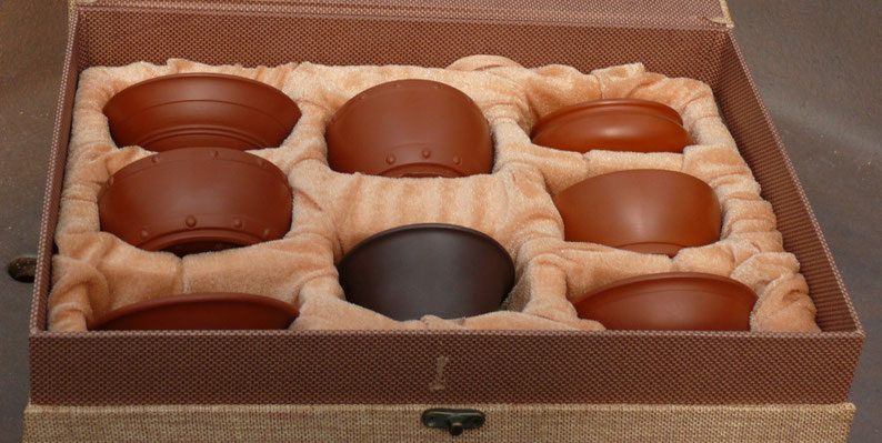 Hochwertige unglasierte Schalen in verschiedenen Formen und z.T. mit feiner Landschaftsbemalung.