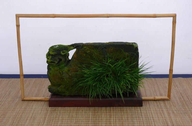 In diesem Fall wurde eine vertikal stehende Steinplatte mit einem Drachenkopf in der linken oberen Ecke verwendet, um Moos und ein Gras darauf zu pflanzen. Der Bambusrahmen betont die rechteckige Form sehr schön.