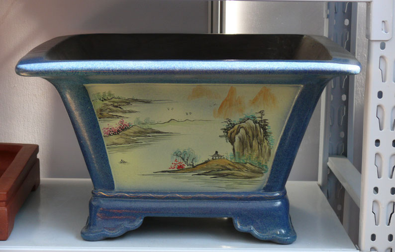 This pine combines three bonsai styles: informal upright, slanted and cascade. The pot is another classic shape, with indented corners and a raised frame.