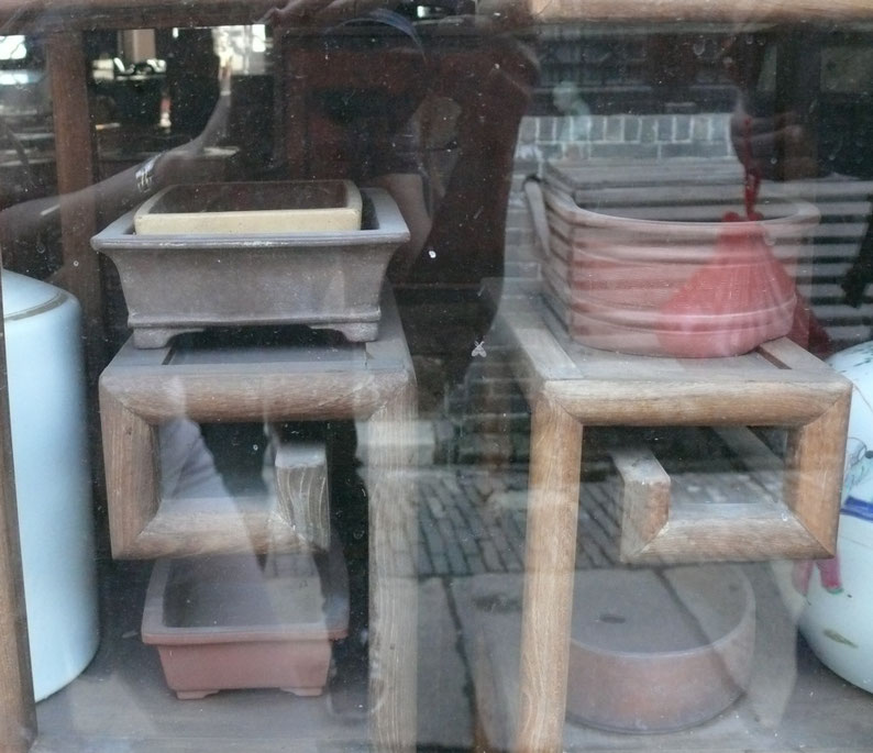 In the (dirty) shop window of an antiques shop in the ancient town of Rugao there were some old bonsai and buld pots for sale.