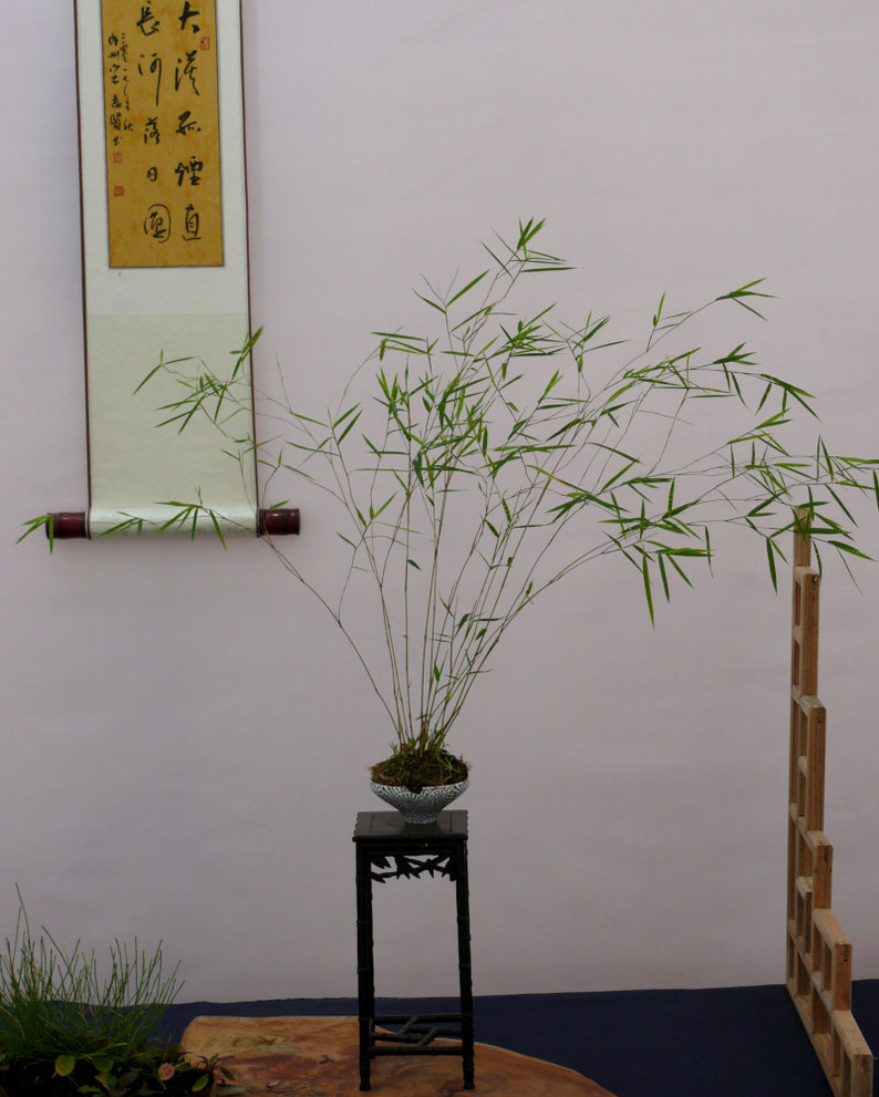 In this case a vertical stone slab with a dragon head in the upper left corner was used to let moss and a grass grow on it. The bamboo frame accentuates the rectangular shape nicely.